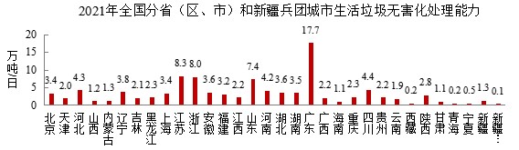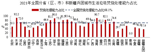 天津、海南、浙江、江西、四川、福建、江蘇、山東、云南、安徽、河北、廣東、河南、上海、貴州、廣西和重慶17個省(區(qū)、市)城市生活垃圾焚燒處理能力占比超過60%;湖北、甘肅、吉林、湖南、山西、北京、寧夏、遼寧、黑龍江、新疆和陜西11個省(區(qū)、市)在40%-60%之間;內(nèi)蒙古、西藏、青海3個省(區(qū))和新疆兵團不足40%。