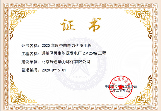2020年7月,綠色動力北京城市副中心(通州)循環(huán)經(jīng)濟產(chǎn)業(yè)園項目收到了中國電力建設(shè)企業(yè)協(xié)會頒發(fā)的榮譽證書,項目一期工程被評為“2020年度中國電力優(yōu)質(zhì)工程”。該獎項是我國電力建設(shè)行業(yè)工程質(zhì)量的最高榮譽獎,由中國電力建設(shè)企業(yè)協(xié)會負責(zé)組織實施,獲得獎項的工程建設(shè)質(zhì)量的綜合指標應(yīng)達到國內(nèi)同期、同類先進水平。