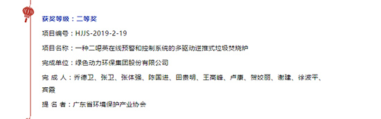 2019年12月30日,中國(guó)環(huán)境保護(hù)產(chǎn)業(yè)協(xié)會(huì)正式發(fā)布授予全國(guó)49個(gè)項(xiàng)目“2019年度環(huán)境技術(shù)進(jìn)步獎(jiǎng)”的決定。由綠色動(dòng)力集團(tuán)申報(bào),廣東省環(huán)境保護(hù)產(chǎn)業(yè)協(xié)會(huì)提名的“一種二f英在線(xiàn)預(yù)警和控制系統(tǒng)的多驅(qū)動(dòng)逆推式垃圾焚燒爐”技術(shù)榮獲“2019年度環(huán)境技術(shù)進(jìn)步獎(jiǎng)”二等獎(jiǎng),綠色動(dòng)力集團(tuán)成為本次獲獎(jiǎng)名單中唯一一家垃圾焚燒發(fā)電企業(yè)。