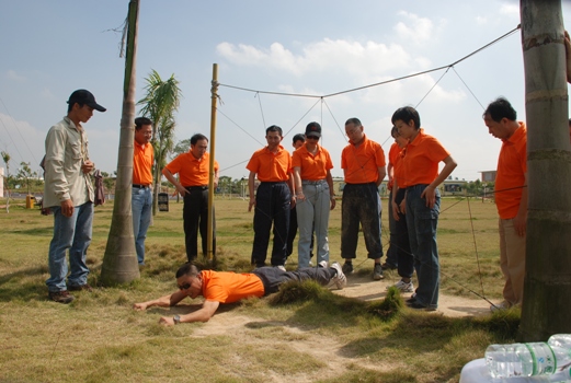 ????? 在專業(yè)拓展教練的組織和帶領下,所有人員分成紅黃兩隊進行訓練,在一系列輕松、活潑的準備活動之后,兩組隊員先后分別進行了“天使之手”、“空中獨木橋”、“地雷陣”、“蜘蛛網”和“勝利墻”等訓練項目。“天使之手”是兩位隊員在8米高空中相互攜手走過鋼絲,“空中獨木橋”是每位隊員獨自走過橫在8米高空的鋼管,“地雷陣”是每組隊員通過集體智慧在10*10的地雷陣中找到唯一的求生通道,“蜘蛛網”是每隊隊員通過集體協(xié)作穿過一組大小不等的繩網,“勝利墻”則是全體人員通過組織、配合和協(xié)作徒手攀上4.2米高的水泥墻。每項活動后,教練都組織每隊人員暢談活動心得和感受,讓大家能夠從活動中得到啟發(fā)和收獲。